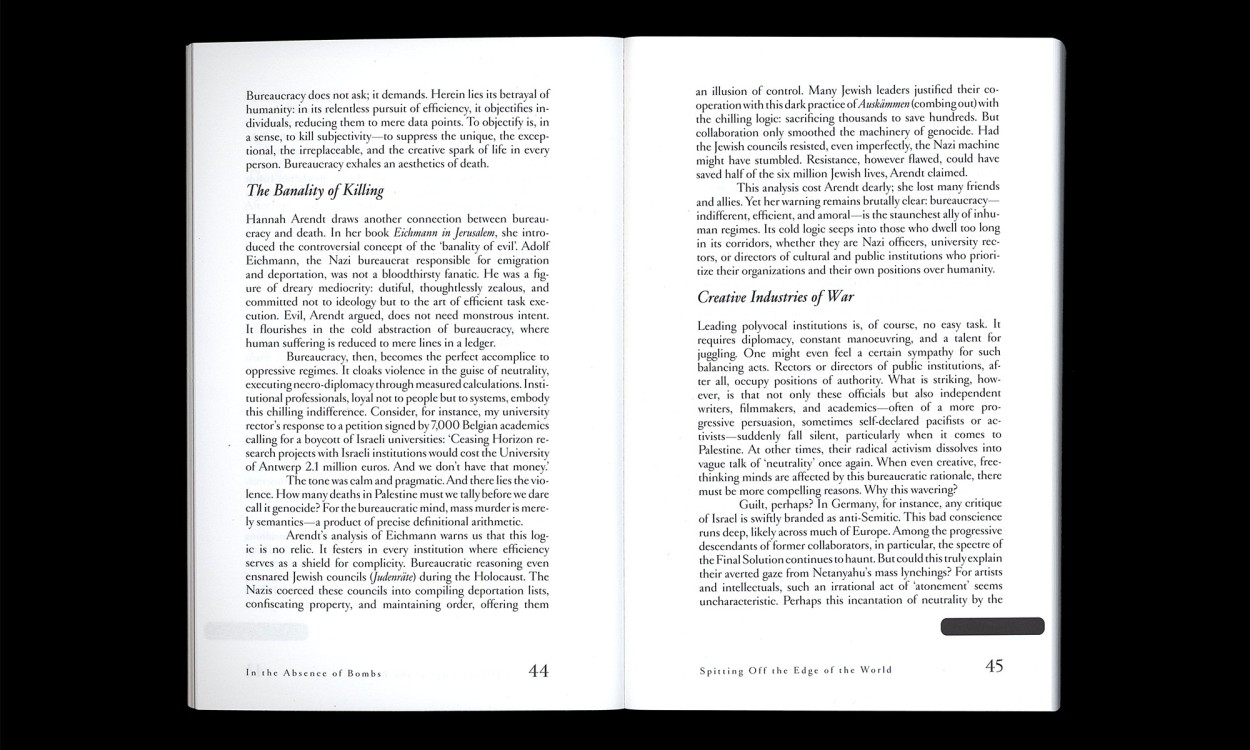 Aan de hand van getuigenissen uit Gaza en Charkiv, uit Beiroet en Brussel, brengen de samenstellers Pascal Gielen en Bahia Shehab een meerstemmig antwoord op een wereld die om duidelijkheid vraagt, maar die die tot nu toe niet biedt. In the Absence of Bombs moraliseert niet. Het dringt aan: op betrokkenheid, op aandacht, op het recht op rouw. En biedt een andere verbeelding van de rauwe werkelijkheid. Niet louter representatie, maar een waardige esthetiek die raakt en blijft raken.